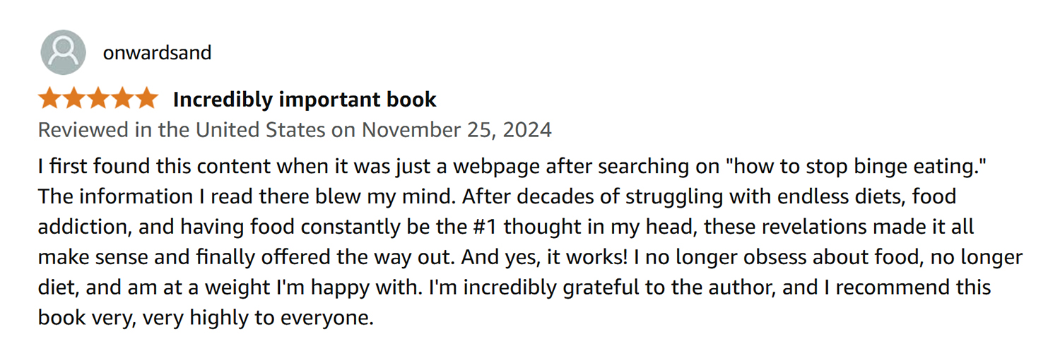This isn’t another mindful eating or intuitive eating book. It is an information-based treatment centered around acquiring an accurate understanding of the problem.